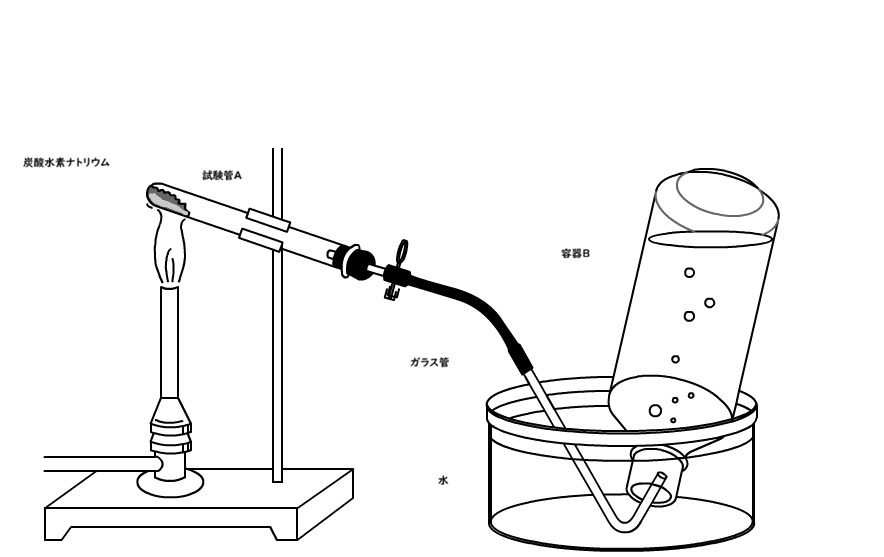 炭酸水素ナトリウムを試験官Aに入れて加熱。